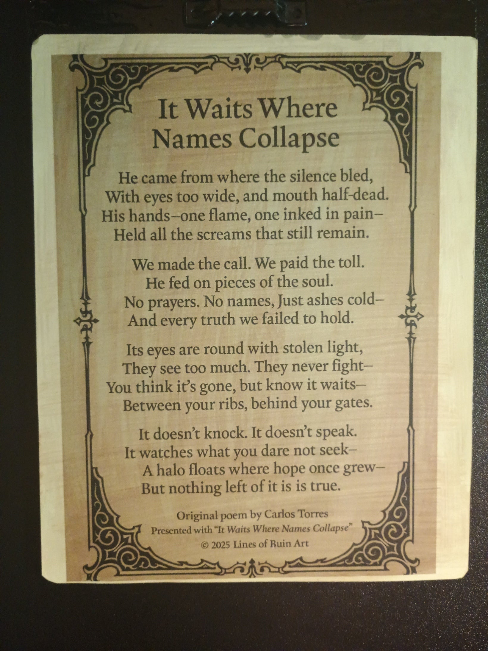"It Waits Where Names Collapse" — 5¾ x 7¾ Custom Wooden Plaque by Carlos M. Torres