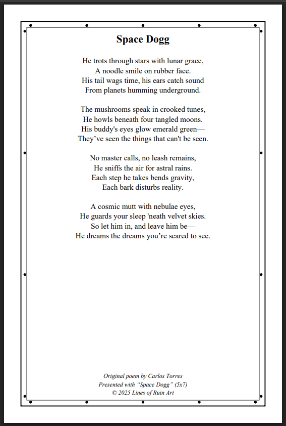 The monochrome ink lines pop vividly on a planetary backdrop, while the vivid pink-and-purple frame adds a psychedelic punch. This piece is as much a space oddity as it is a love letter to strange worlds and stranger inhabitants. (Includes a 4x6 original poem placard)