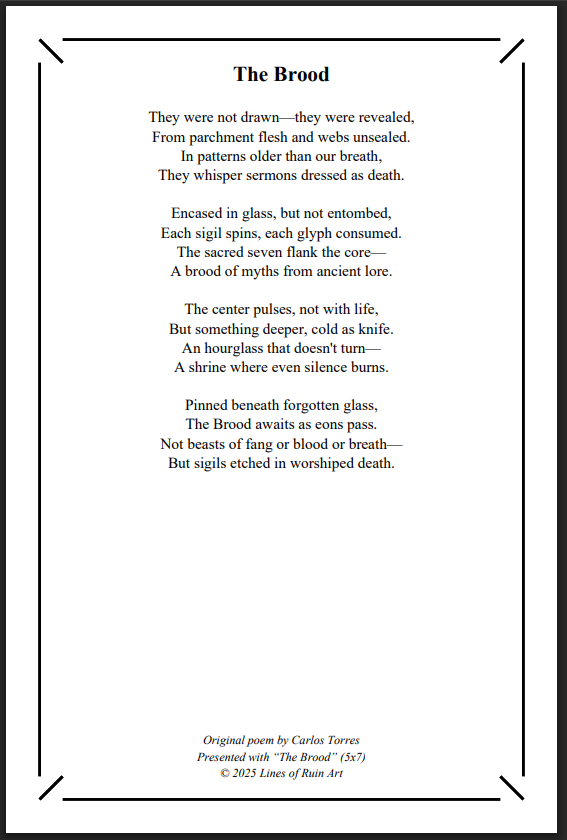 The Brood captures the imagined remnants of a sacred arachnid lineage. At first glance, The Brood appears to be a taxonomic plate — a naturalist’s attempt to study a class of arachnid previously undocumented. Seven distinct forms are arranged around a central entity, which is far more than anatomical. Its hourglass figure and symmetrical posture suggest worship, not simply observation. Cataloged, labeled, and preserved as though pulled from the dusty archives of a long-abandoned occult laboratory. This piece blurs the line between natural history exhibit and ritual artifact, giving the viewer a window into a world where creatures are catalogued not just for biology, but for belief. Framed in a way that evokes both entomology and the occult, The Brood belongs among artifacts, not decor. (Includes a 4x6 original poem placard)